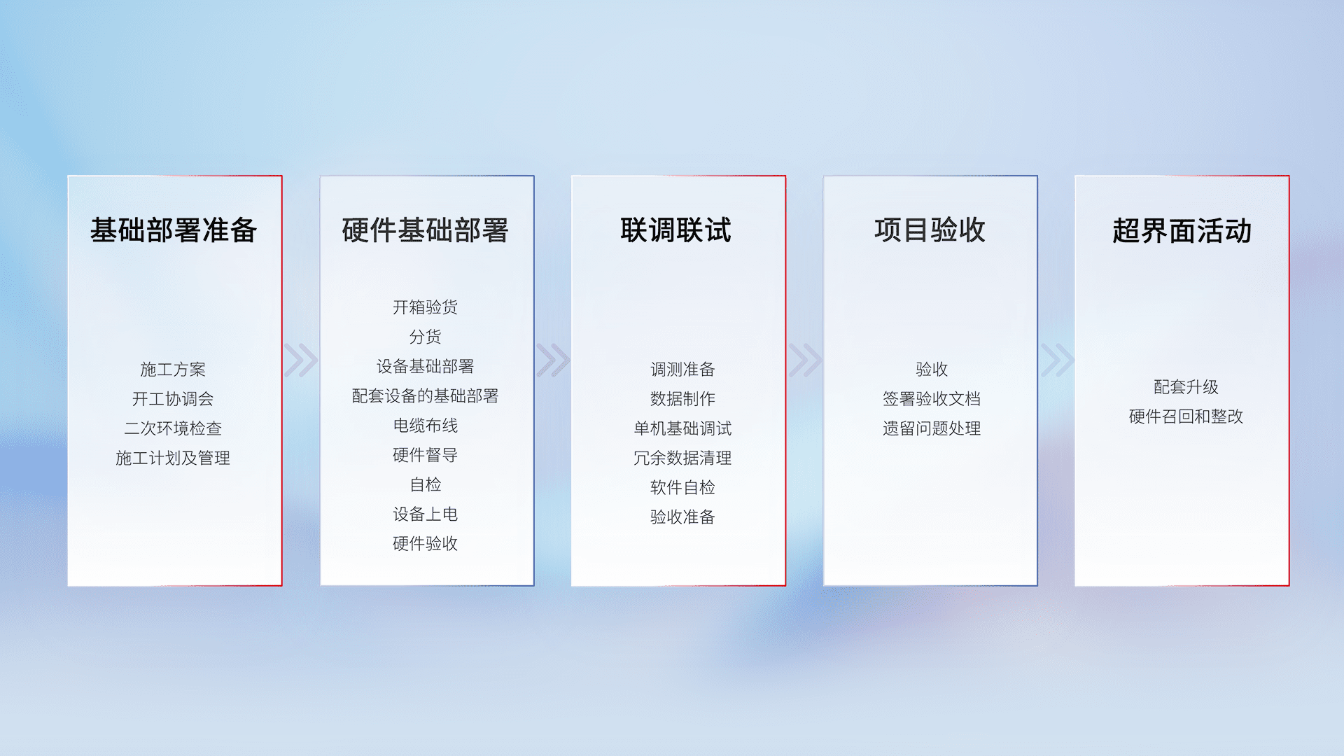 从基础部署准备、、、硬件基础部署、、、、联调联试、、、、项目验收、、、越界面活动的全过程可追溯,,,,保证施工质量和进度。。。。